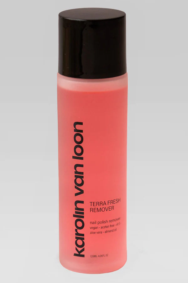Deze nagellak remover van Karolin Van Loon verwijdert zachtjes gewone nagellak terwijl het de nagels voedt met aloë vera, amandelolie en vitamine E.