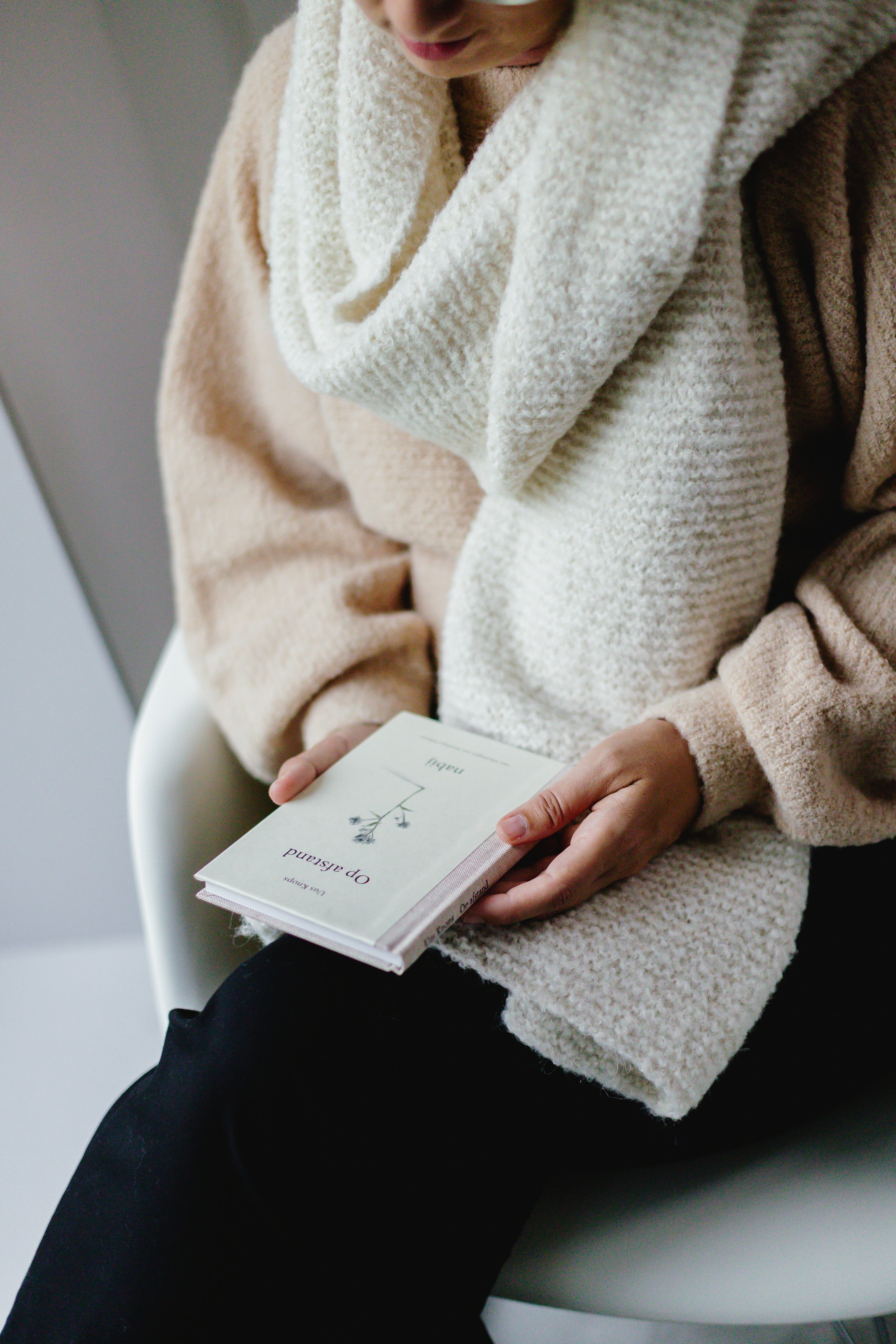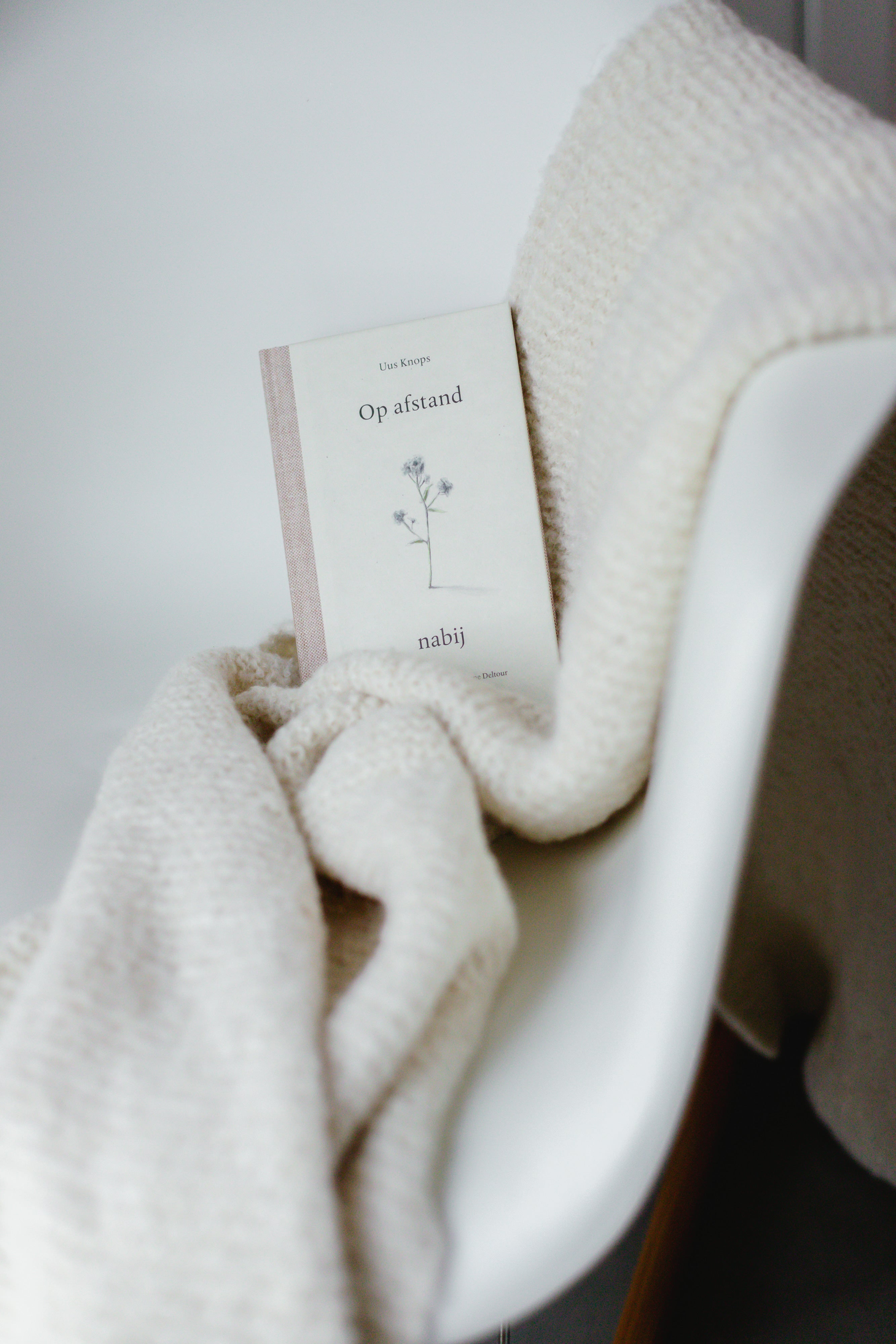 Schenk een dierbare die door een rouwproces gaat een brei-box om zelf aan de slag te gaan om een sjaal naar keuze van LNKnits te breien, bijvoorbeeld de Big Bertha, én extra troostende woorden met het boek van Uus Knops: 'Op Afstand nabij'.