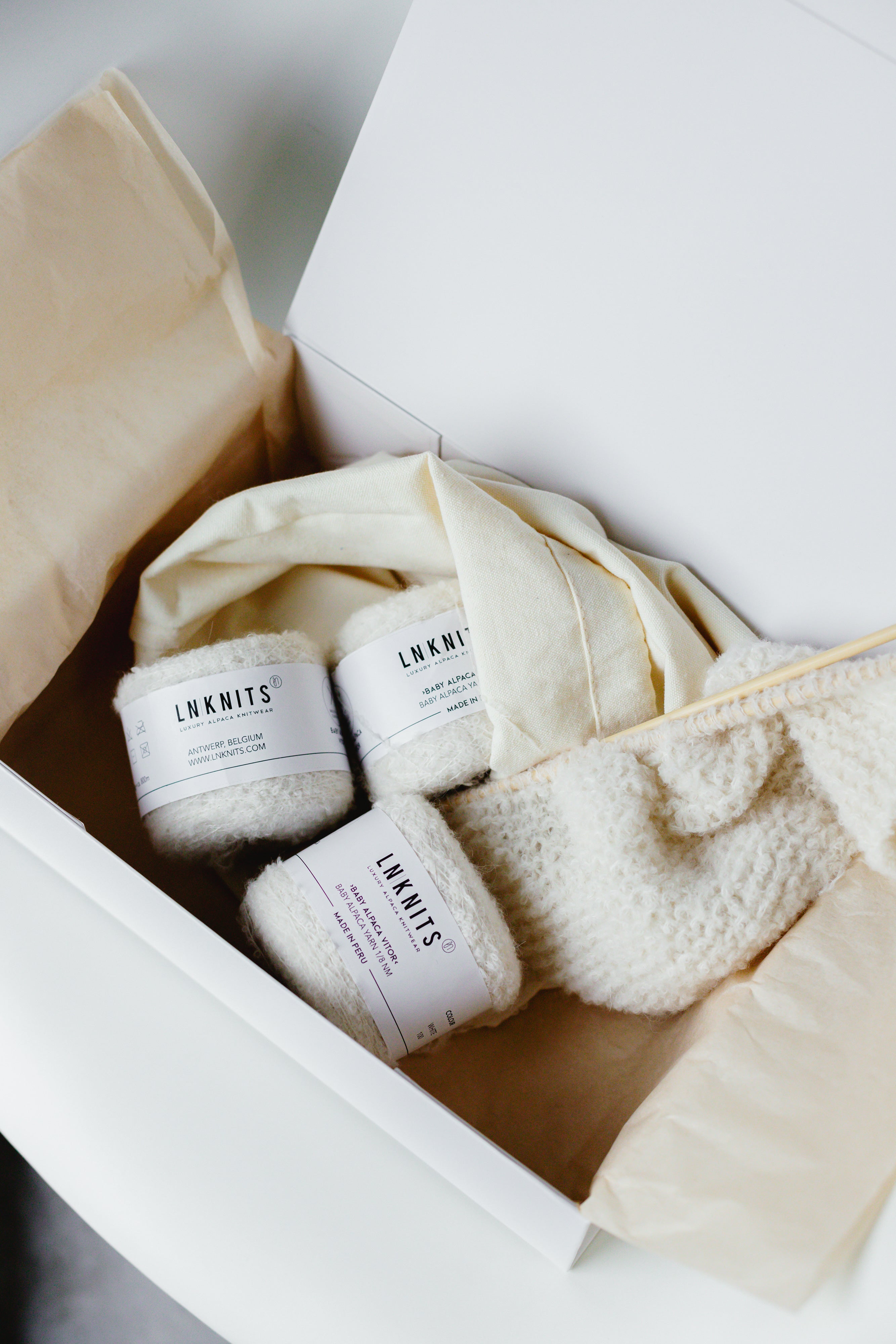 De bolletjes baby alpaca, de breinaalden, het opbergzakje én het boek 'Op Afstand nabij' wordt verstuurd in een mooie doos, die nadien ook nog gebruikt kan worden om kaartjes of andere mooie herinneringen in te bewaren.