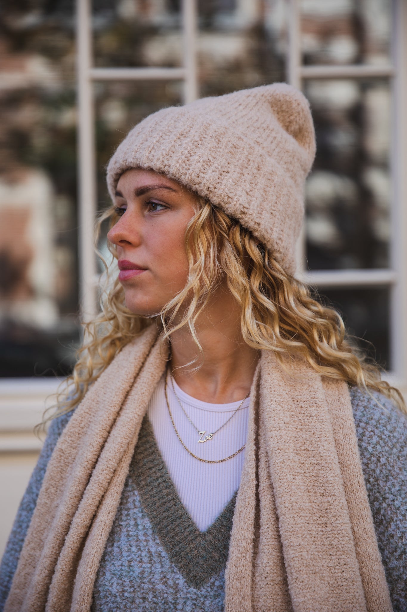 In tegenstelling tot onze andere wintersjaals is de Roseanne sjaal volledig met de hand gemaakt op de handbreimachine in plaats van met de breinaalden. Dit resulteert in een stevige maar toch soepele structuur, waardoor je deze sjaal meerdere keren om je nek kunt wikkelen. De zoom is gebreid in een ribsteek, waardoor deze opvalt en een subtiel accent toevoegt aan de algehele look van de sjaal.