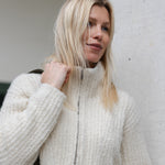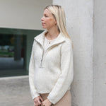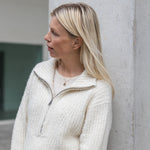 Een traditionele half zip jumper, gebreid in een omgekeerde half cardigan steek voor extra stevigheid en een minimum aan pilling. De hoge kraag met elegante V-vormige schouderdetails maakt van de Clever Cleo ongetwijfeld de blikvanger van dit seizoen.